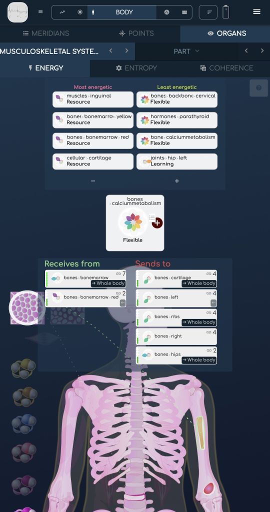 • Our proprietary research shows the links between elements, allowing for the first time an assessment of energetic relationships between organs, meridians or MTC points, or any biomarker chain within a system: who is in demand, and who gives energy out.