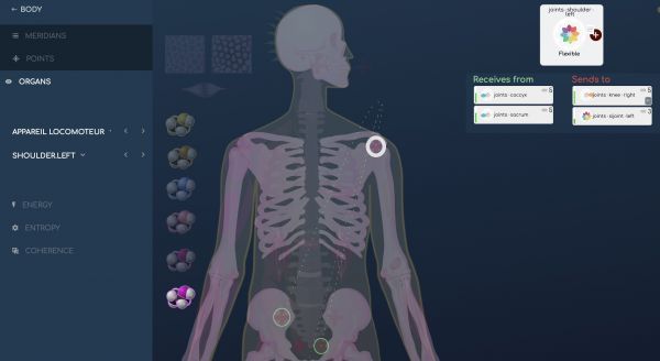 تُبرز الروابط بين عناصر النظام العضلي الهيكلي (العظام، العضلات، وكذلك الهرمونات وبعض الأعضاء) هنا بشكل رسومي؛ كما أنه من الممكن أيضاً عرض الأكثر بروزاً من وجهة نظر طاقية، الأكثر أو الأقل نشاطاً، وتلك الموجودة في توازن