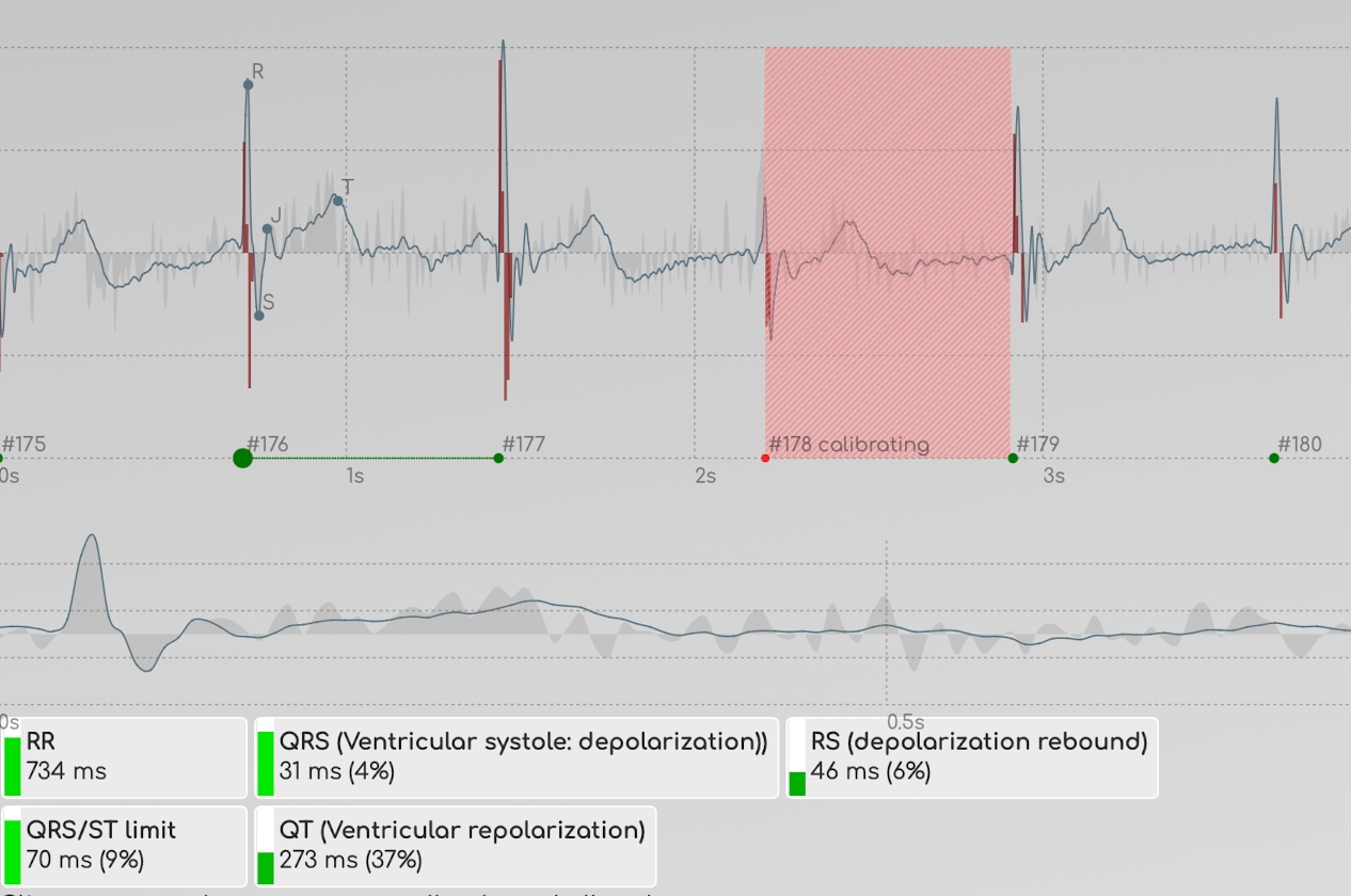 Agregamos un filtrado automático para excluir los latidos que son problemáticos (porque, por ejemplo, el usuario se movió y la señal eléctrica se salió de los gráficos durante unos segundos), y en ese punto, podemos comenzar a analizar esta grabación para extraer características.