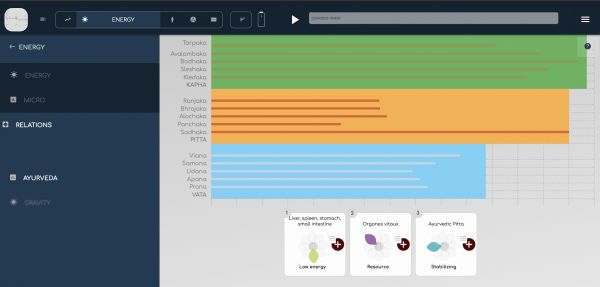 Ayurvedic practitioners know how to work with the energetic constitution of the body. The three main constitutions are Vata, Pitta and Kapha, each with 5 sub-doshas. In a BioCoherence analysis, you can see each dosha and sub-dosha move when you move the time cursor, because all these systems are dynamic. The way they move is part of our assessment.