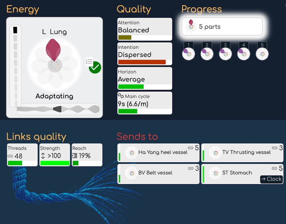 अब इसकी नई अद्भुतताओं के साथ जटिलता का एक और स्तर आता है। हमारे पास मौजूद सभी 2nd क्रम के नए डेटा का उपयोग करते हुए, हम नई विशेषताओं की गणना कर सकते हैं, जैसे कि तत्वों के बीच लिंक। ये लिंक ऐप में हर जगह दिखाए जाते हैं, जैसे ग्राफ या शरीर के मानचित्र पर; वे हमें मुख्य ऊर्जा संबंधों को समझने की अनुमति देते हैं, जैसे अंगों के बीच: यदि एक अंग दूसरे से जुड़ा हुआ है, तो यह संकेत कर सकता है कि एक ऊर्जा स्थानांतरण हो रहा है, और एक दूसरे की सहायता कर रहा है या मदद कर रहा है।