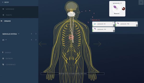 A nervrendszer elemei közötti kapcsolatokat grafikusan kiemelve itt; az is lehetséges megjeleníteni a legjelentősebb elemeket energetikai szempontból, a többé kevésbé izgatott állapotokat, valamint azokat is, amelyek koherenciában vannak. A nervrendszer tartalmazza az agyat és az agy részleteit, a idegeket és bizonyos idegek részleteit, valamint az gerincvelőhöz kapcsolódó idegeket.