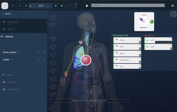 Ha rákattint a "Test" majd az "szervek" gombra, a modul megnyílik a test általános áttekintésével together, beleértve a legfontosabb biomarkerek választékát: fő szervek, fő hormonok, a mozgásszervi rendszer főbb részei, vér, sejtek.Ha rákattint egy szervre, vagy kiválasztja a menüből, körülötte egy fehér fény lesz, és a legfontosabb linkek a további szervekkel ezen a képernyőn megjelennek (vörös körbe rajzolva ha energiát kap a kiválasztott szervtől, és zölden ha energiát küld felé).