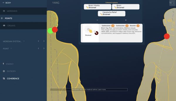 - Facendo clic su Coerenza, le ricette i cui punti sono completamente in fase insieme (questo significa, che i loro punti risuonano insieme e si muovono insieme come un unico punto) vengono visualizzate. Fai clic su una ricetta per vedere i punti sulla mappa e ottenere indicazioni. Quando aggiunta alle priorità, la ricetta verrà utilizzata nella parte Bilanciamento per aiutare a riequilibrare i suoi effetti.