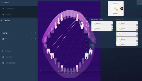 Lenkene mellom tenner og tannkjøtt er grafisk fremhevet her; det er også mulig å vise de mest energisk signifikante tennene, de som er mer eller mindre agiterte, og de som er i koherens.