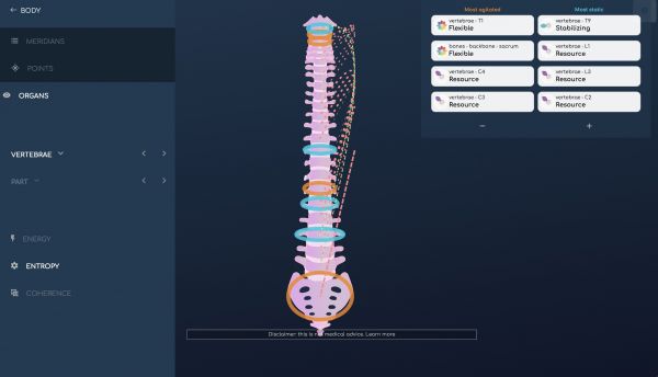 Кожна карта тіла має підменю Енергія, Ентропія та Когерентність, нижче меню карт та меню частин.